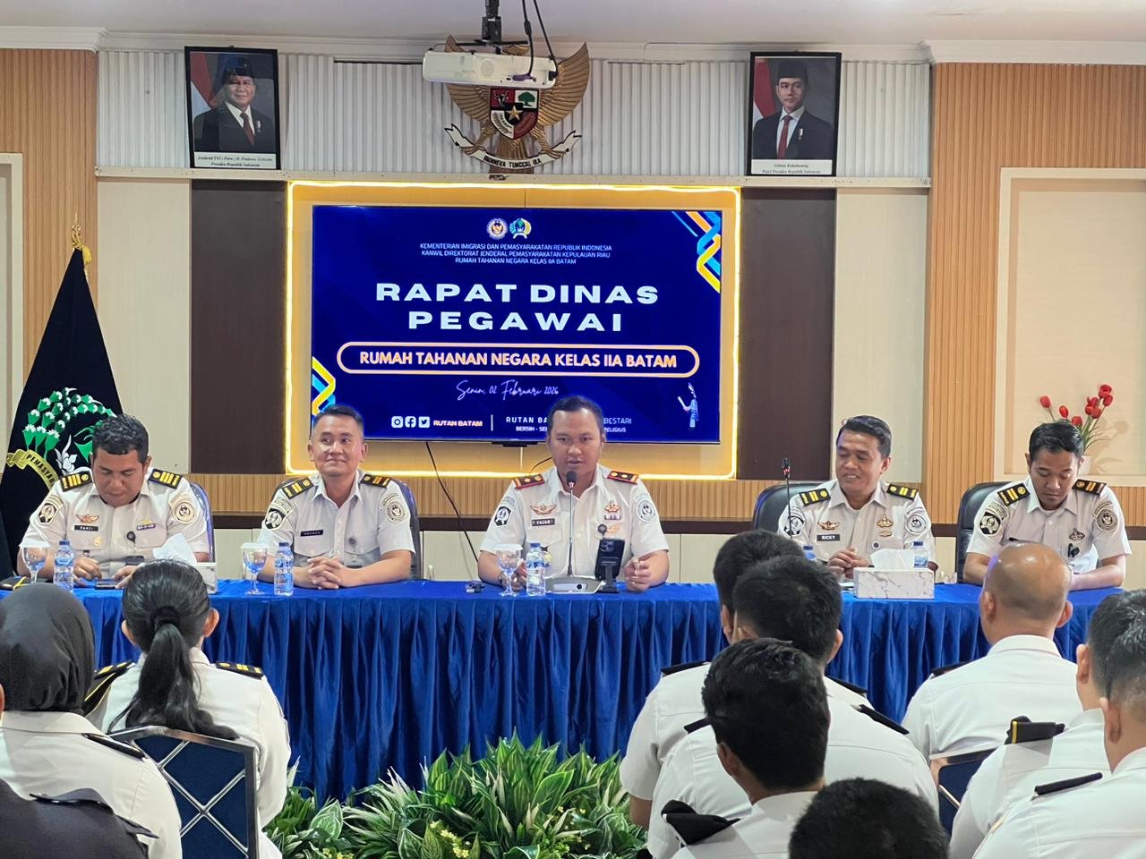 Rapat dinas dipimpin langsung oleh Kepala Rutan Kelas IIA Batam, Fajar Teguh Wibowo, S.H., M.H., didampingi para pejabat struktural Rutan Batam.