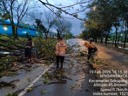 Batam, maritimraya.com (mara) – Hujan deras disertai angin kencang yang melanda wilayah Kecamatan Sekupang menyebabkan sebuah pohon tumbang di Jalan RE Martadinata, tepatnya seberang Beta Kopi, Kelurahan Sei Harapan, Kecamatan Sekupang, pada Kamis (19/02/2026) sekitar pukul 17.00 WIB.